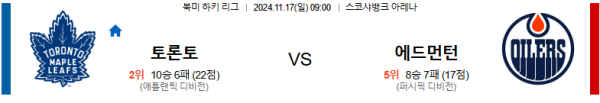 11월17(일) 09:00NHL토론토:에드먼턴 하키분석자료