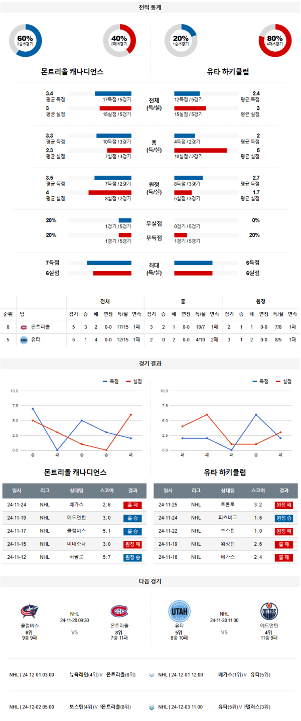 11월27(수) 09:00NHL몬트리올:유타하키클럽 하키분석자료